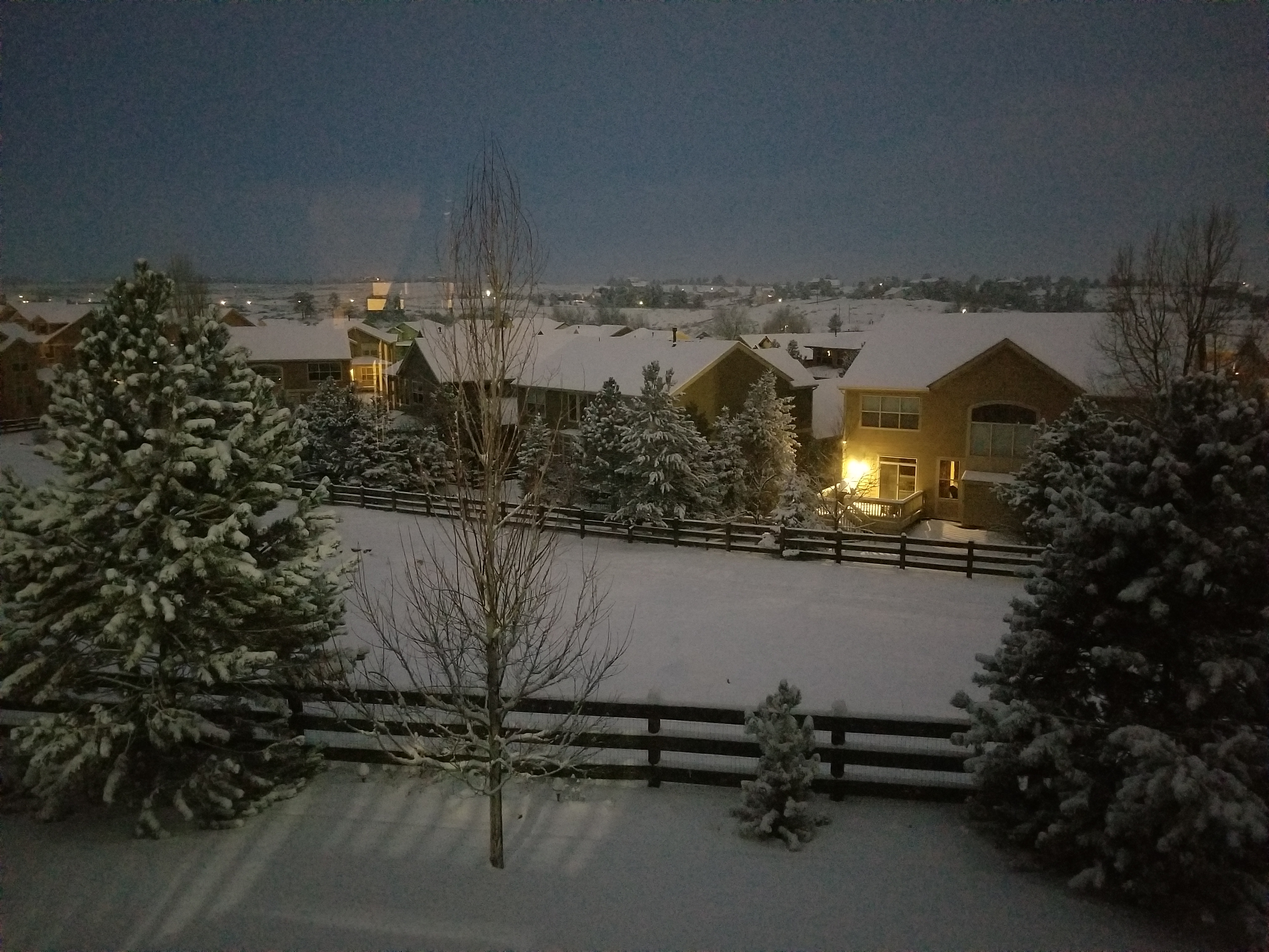 The Callahan backyard. We back up to an open space. I planted all the trees. I planted the two big Austrian Pine trees when they were smaller than the little one in the middle. Soon he will be as big as his brothers.